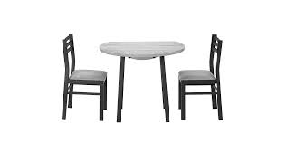 Give a big lift to a small, casual family dining space with this versatile 3 piece dining set for two. The 35" drop leaf round table with an easy to clean top, features two handy drop leaves: lift them up when you need more surface space, fold them down when you don't. The rustic, grey laminate wood-look finish of the thick table top provides a striking contrast to the modern black finish on the sturdy black metal supports on the table and chairs. For comfort, the ladder-back chairs have padded seats upholstered in a soft, grey fabric. This practical and fashionable style of this casual dining set has a space saving design, making it ideal for apartments, dorm rooms, or eat-in kitchens. This 3pcs set includes easy to assemble illustrated instructions and a 2 year limited warranty for manufacturer's defects.Features