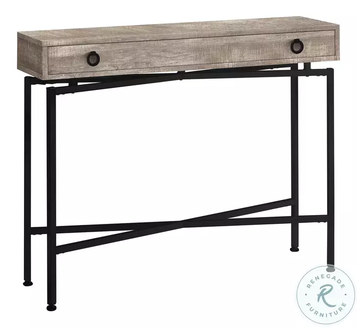 Add a touch of contemporary styling to your home with this taupe reclaimed wood-look console table. Ideal for entryways, hallways or anywhere you would like to showcase your favorite accent pieces, this table will blend seamlessly with any decor. Featuring a sturdy black metal base and a chic brown reclaimed wood-look top, with a large storage drawer, this fashion-forward piece will provide years of lasting enjoyment.Features