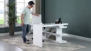 This home office desk features a turntable shelf that rotates completely to position left, right or closed, nesting the shelf area under the desk.Features