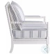 Light and bright as can be, this contemporary accent chair offers a cheerful look to any space. This accent chair offers comfortable seating with each cushion wrapped in a white linen-like upholstery accented with navy awning stripes. With a sharply designed frame that includes decorative spindle back posts, legs and armrests, all in bright white finish, this accent chair lends a subtle boho style. In addition, this accent chair offers extra details such as padded armrests and welt trim. Place this nautical-inspired accent chair on a covered veranda or a sunroom for a crisp, clean look.Features
