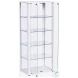 Gather all your favorite things and show them off to their best effect in a modern glass curio cabinet. Perfect for everything from China in the dining room to sculpture and art in you living area, the cabinet features rounded corners and a neutral finish, offering crisp style in any setting. Its glass sides and back are complemented with a pair of clear glass doors, offering a full view of items placed within. Four glass shelves hold an impressive number of treasures, creating a curated display you'll love. Recessed lighting completes the look to perfection.Features
