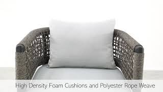 Bring outdoor furniture that exudes modern charm to your home with the Alegria Outdoor Patio Counter or Bar Stool in Aluminum with Rope and Gray Cushions from Armen Living. The modern and clean line silhouette of this outdoor chair with cushions is complimented by unique woven rope arms. The rope is treated to be protected from water, UV, oil, and fading. The lightweight aluminum frame of this outdoor stool is easily portable and features a multi-layer powder coating for further effective protection from the elements and everyday wear and tear. The light gray cushions not only feature high density foam that will allow for many hours of comfortable seating; the cushions also feature a zipper closure that allows for easy removal and cleaning! This unique piece of outdoor patio furniture offers a comfortable seat to entertain or simply enjoy your garden or backyard area. The Alegria Outdoor Patio Counter or bar stools are available to you in a 26” counter height or 30” bar height option and supports up to 250 lbs. per stool. The aluminum frame features a modern black finish, light gray cushions, and gray rope.Features
