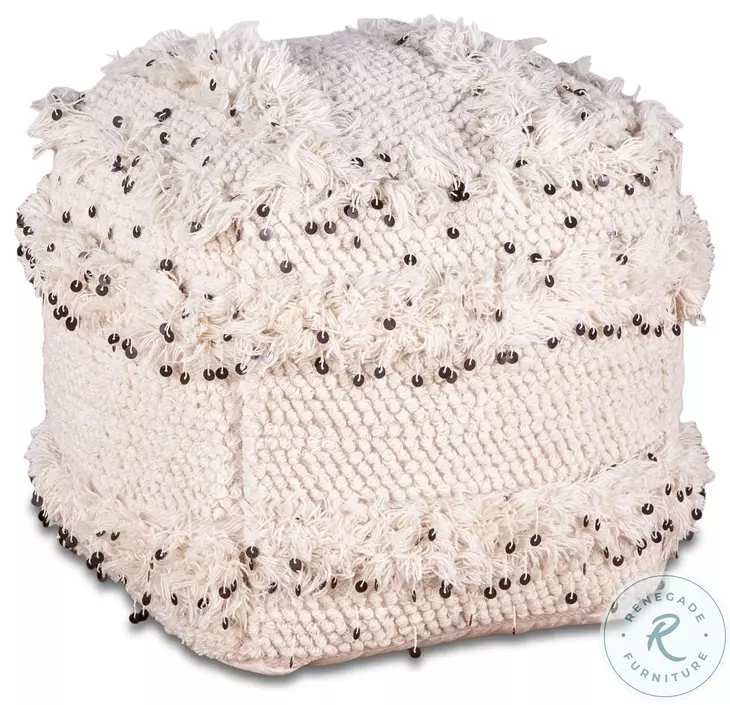 The Algiers collection brings to life the vibrancy of North African culture and combines it with both classic and modern design. Solid wood turned legs and varied and vibrant fabrics highlight this unique collection. This fun, unique square ottoman from the Algiers collection is fully upholstered in white wool and cotton blend fabric with mix-matched weaving and stitching. The ottoman has a foam cushion for comfort, and features dark brown sequins threaded throughout providing a pop of texture and color. This stand-out ottoman is sure to be an excellent addition to any home or setting as a unique accent piece. This ottoman is pre-assembled and made of materials of the finest quality, and with its fun look, it will make an effortless addition to any home.Features