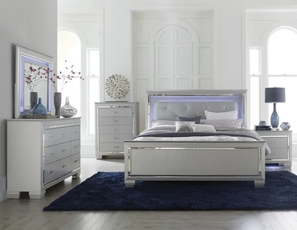 Glamour reigns in the design of the Allura Collection. Framing each piece is a decorative beveled mirror accent that enhances the illumination from the touch-engaged LED back-light of the headboard and mirror, as well as the under-light of the night stand. Alligator embossing and high polished crystal-enhanced hardware boldly accent the silver finish of the collection.