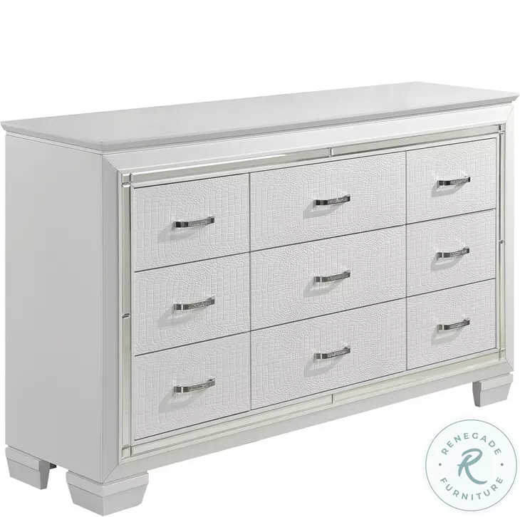 Glamour reigns in the design of the Allura Dresser. Framing the dresser is a decorative beveled mirror accent. Alligator embossing and high polished crystal-enhanced hardware boldly accent the white finish.Features