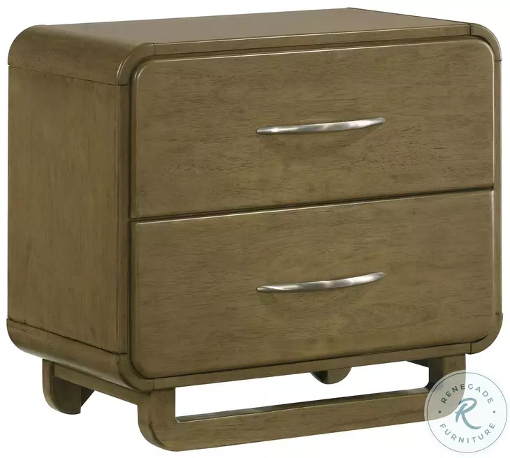 This two-drawer nightstand offers a perfect balance of practicality and modern design. The nutmeg wood finish provides a warm, natural look, while the rounded edges contribute to a sleek, contemporary style. Metal extension glides ensure smooth drawer operation, offering easy access to your essentials. The integrated cord management system keeps your devices organized and within reach. Constructed from solid Asian hardwood, this nightstand is built to last while adding functionality to your bedside.Features