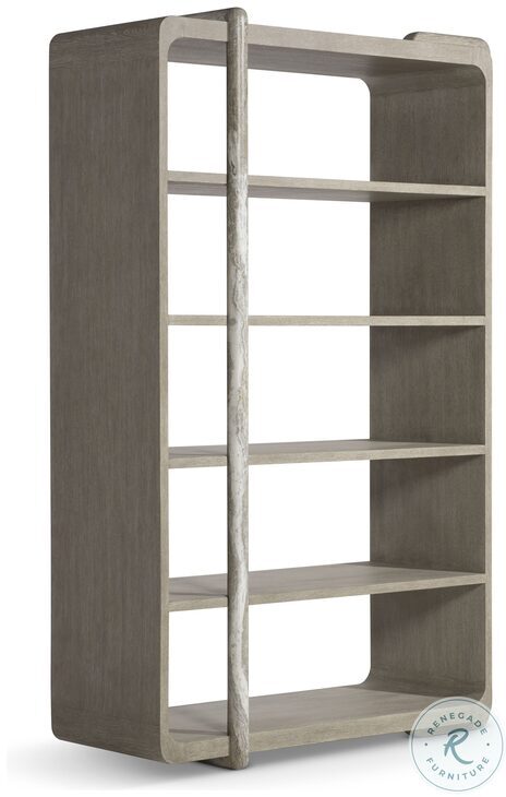 Wrapped shapes and a textural style give the Arcadia etagere a standout design in oak and faux stone. A rounded wood brace in Clay finish curves over one side of the case, while a faux stone post in Kalta encircles the front and back.Features