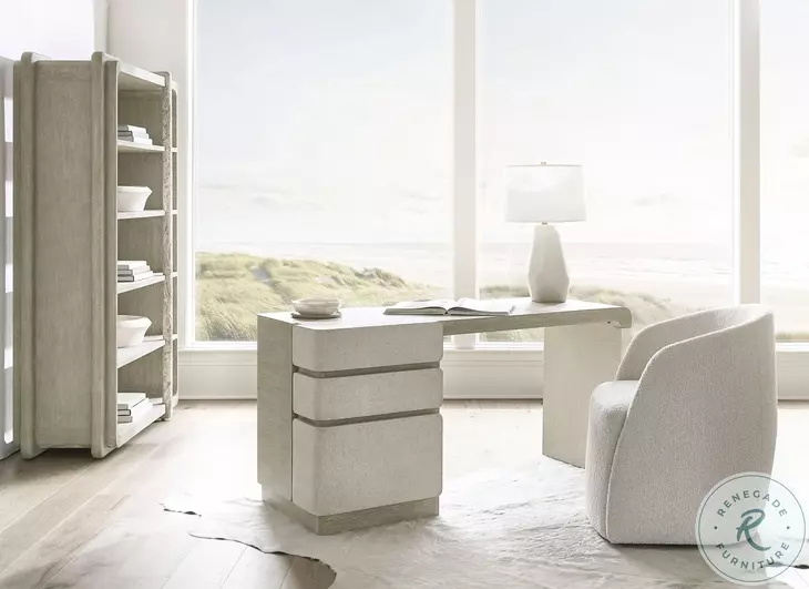 Tactile materials showcase an elemental style on the Arcadia desk. Raffia wraps a support panel and three drawer fronts, curving around the sides for a unique design. The wire-brushed wood is in Clay finish.Features