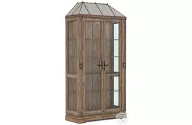 - Display Cabinet features crown top with wood and frosted antique mirror, 2 wood framed glass doors, 2 interior touch operated LED lighting, 1 fixed shelf and 3 adjustable glass shelves, traditional paneling including small medallions and gracefully sloped roofs of european cities