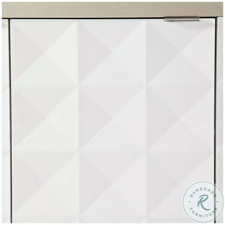 - Buffet features brushed silver finish hardware, linear gray finish on case, white finish on end panels, four doors with cast shaped overlays in white linen finish with soft self closing hinges, clean lines with dynamic 3D motif inverted pyramid door front, behind end doors one adjust and removable shelf, behind paired center doors two drawers and two open compartments, top drawer with silverware insert, second drawer with wrapped pad