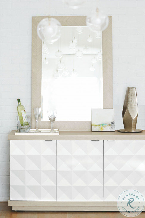 The Axiom buffet creates a fresh, modern look by merging clean lines with a dynamic 3-D motif of an inverted pyramid. This expertly crafted piece features engineered faux anigre veneers in two silky yet low-sheen finishes, Linear White and Linear Gray. These serve as the perfect complement to the hand-applied plaster overlays on the doors, finished in White Linen. With Its sleek form and unique materials, this glamorous transitional buffet makes a sophisticated statement.Features