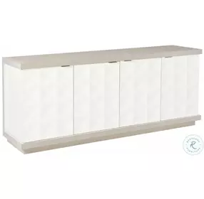 - Buffet features brushed silver finish hardware, linear gray finish on case, white finish on end panels, four doors with cast shaped overlays in white linen finish with soft self closing hinges, clean lines with dynamic 3D motif inverted pyramid door front, behind end doors one adjust and removable shelf, behind paired center doors two drawers and two open compartments, top drawer with silverware insert, second drawer with wrapped pad