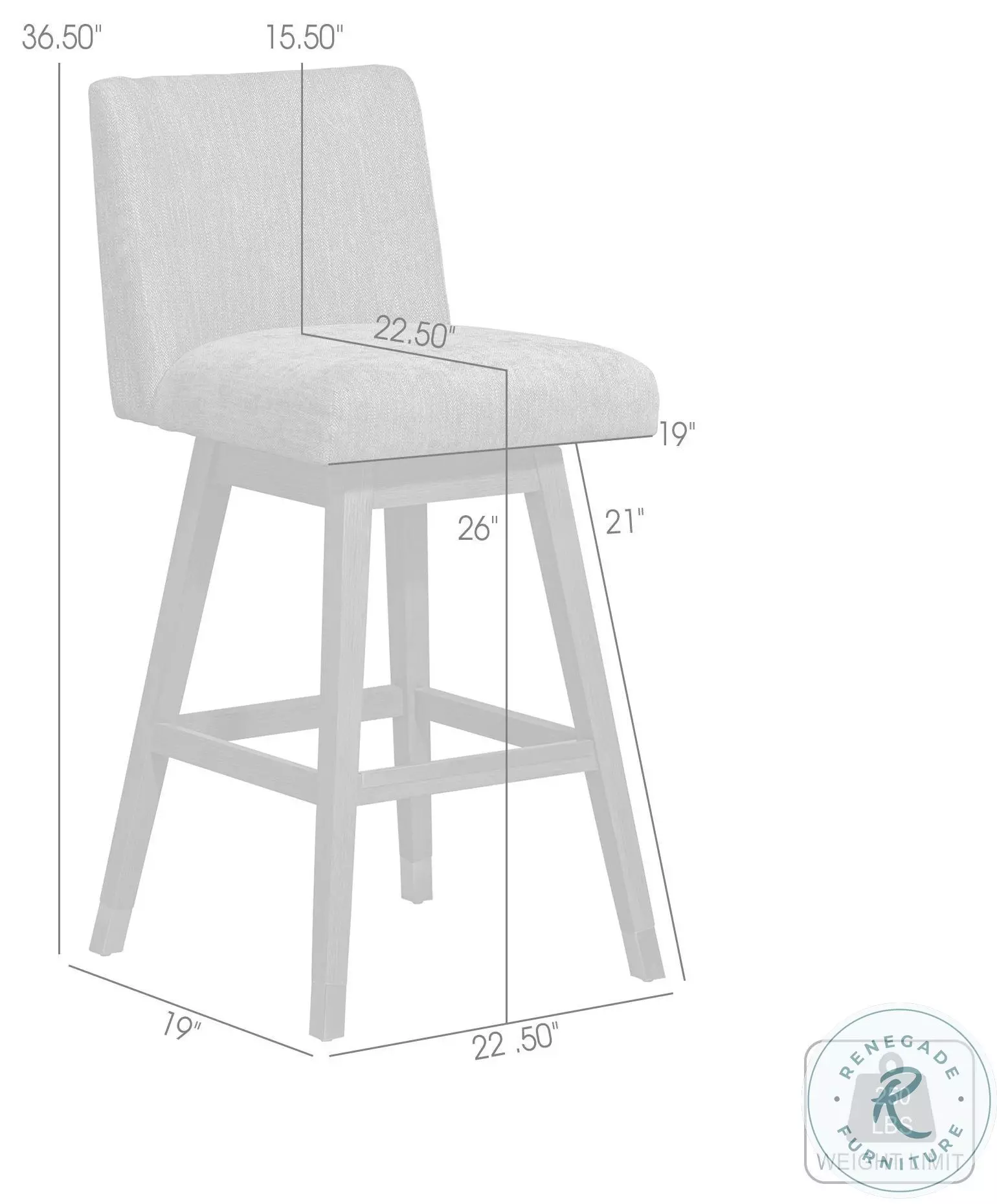 Modern design collides with high quality materials and creates a functional work of art that is the Basila Swivel Bar or Counter Stool in Wood with Fabric Upholstery. The Basila swivel bar stool comes as a welcome addition whether you’re furnishing a new place or updating your kitchen or dining space for a fresh new look. Entertaining is a breeze with the swivel mechanism. The 180-degree memory swivel or ‘spin-back’ seat allows you to swivel either way and the seat always returns to forward facing position when you stand up. The sturdy 4 leg base is constructed from rubberwood. Rubberwood is a durable hardwood belonging to the maple family. Its dense grain character makes it a stable construction material that is naturally resistant to fungus and bacteria. The wood base is further complimented by the soft upholstery. The long-term durability of polyester makes it an ideal choice of stool upholstery fabric for families with children and pets. Polyester upholstery is water repellent, stain resistant, budget friendly, and less prone to discoloration. The combined features of the Basila counter or bar height stools make for an easy choice! This modern bar stool is available in your choice of a 26 inch or 30 inch seat height and comes in a brown oak wood finish with beige or taupe fabric, or a gray oak wood finish with gray or pearl fabric upholstery.Features