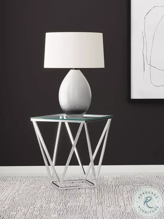 Simple geometric shapes are configured to create a modern end table greater than the sum of Its parts. The superb design features open, flared triangles crafted in metal and receiving a gleaming nickel finish. On top, a square slab of glass creates a smooth, airy table top ready to host cocktails or a vase of flowers. The square table top is echoed in the base of the table, but turned 90 degrees to create a diamond, delivering a surprising touch of artistry and elegance. Showcase the table at the center of a welcoming foyer or add it to a sleek leather seating group to create contrast in texture and color.Features