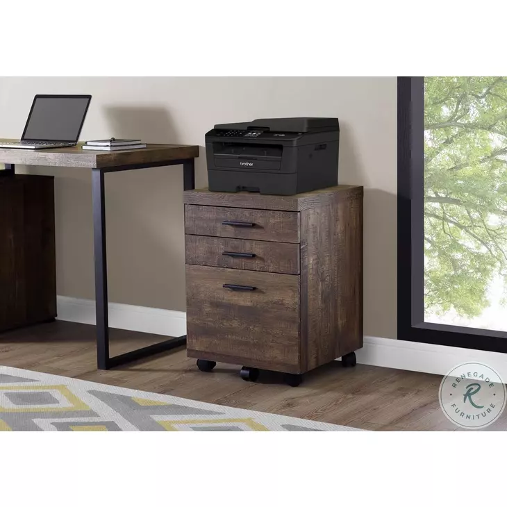 The trendy and industrial look of this 3 drawer filing cabinet on 5 castors will bring a stylish dimension to your office space. Add this multi-functional filing cabinet, finished in a chic brown wood grain look, to any desk or table to create more storage. Accented with simple modern black handles, the top two drawers are useful for files, papers or books while the bottom drawer can fit standard or legal sized hanging folders. Whether tucked under a desk or placed on the side for a printer, books or other decorative items, this filing cabinet will be the little extra you needed in your work area.Features