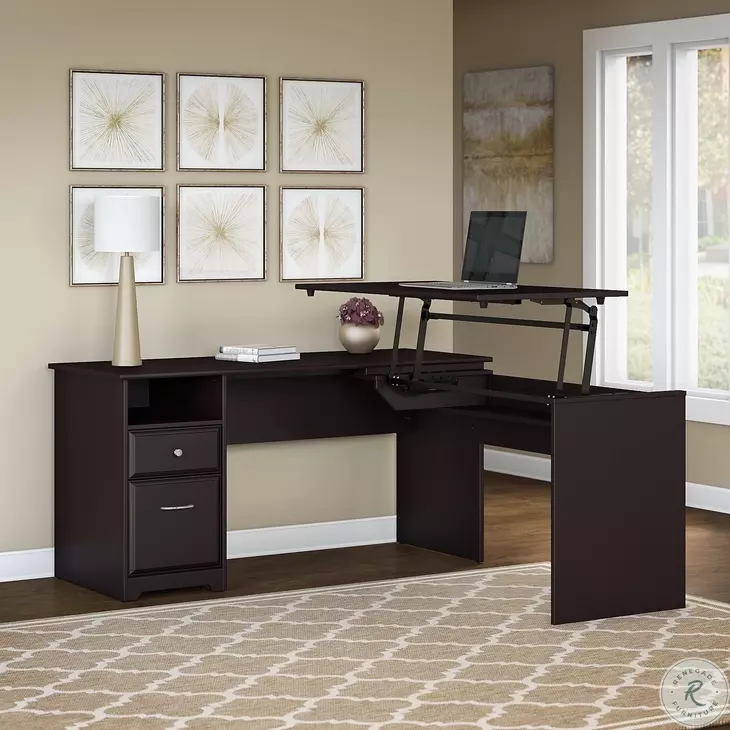 The Cabot L Shaped Sit to Stand Desk turns your home office into an ergonomic workstation designed to help you get organized and be more productive. With a wide work surface you'll enjoy plenty of room for multitasking, and you can save space as the adjustable desk fits perfectly in a corner. Smoothly lift and lock the Return desktop to standing height positions of 37, 40 or 43 inches from the floor and work comfortably, or use the easy adjustability and have a seat when your legs get tired. The Return desktop holds up to 20 pounds when at standing height so you can bring materials with you when you need to stretch your legs. Organize your workspace as this desk with storage includes a box drawer and cubby shelf for supplies, along with a full-extension file drawer. Chrome-finished hardware complements the Espresso Oak finish. See the full collection of coordinating home furnishings, and design your dream office with the elegant and efficient Cabot Collection.Features