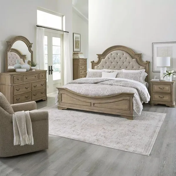 Camellia Manor Weathered Bisque Upholstered Queen Panel Bed
