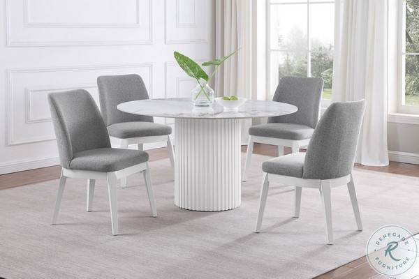 Instill a light, airy sensibility with a set of two modern dining chairs. Each side chair offers excellent comfort and support, complete with foam cushions and rubberwood framing. The set features a white finish over straight, splayed legs and an apron, creating a light, fresh base. The tall back and plush seat feature foam under soft upholstery in a neutral hue. Choose this pair of side chairs for kitchen or dining room and enjoy wonderful style and comfort.