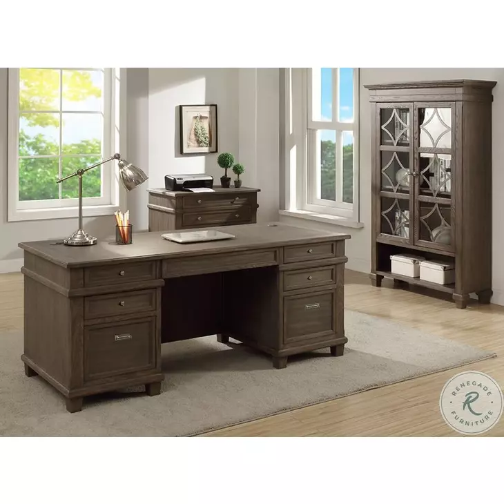 Constructed of solid Pine and Ash veneers, Carson Office fits well in any home or executive office. Weathered dove finish accentuates the natural open grain, creating a casual yet elegant look. Mottled antique finish hardware and four point diamond metal accents enhance the Carson collection.Features