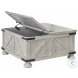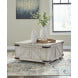 Unlock a quaint touch of farmhouse style and convenience in your living area with this Carynhurst Collection. Its design is inspired by the rugged looks of an antique storage trunk. Metal keyhole and bracket accents with rivets, a planked effect and large recessed bun feet dress up this charming piece. The distressed light gray finish enhances the wood's natural grain, which delivers a naturally aged feel. You’ll love its generous scale, offering a roomy top that's ideal for displaying accents and more. Lift the top and enjoy the accommodating work or dining surface. Under the lift top, there's a fully finished storage area deeply spacious for organization.