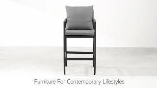 Entertain all year round with the exquisite Cayman outdoor counter or bar stool from Armen Living. Featuring a minimal and sleek design, this outdoor patio bar stool brings effortless style to your backyard, patio, pool area, garden, or screened-in porch. Rattan is intricately woven around the back of the seat to serve as a unique and elegant detail and featuring ergonomic properties to keep your back properly aligned. This unique piece of metal and wicker patio furniture includes plush dark gray high density foam cushions to offer a wonderfully comfortable sitting experience. The cushions also feature a zipper closure that allows for easy removal and cleaning making this the ideal piece of outdoor patio furniture! Featuring an inviting and versatile design, this outdoor bar stool with back sits easily in any outdoor setting. Made up of lightweight and durable aluminum framework, the Cayman metal barstool is easily portable and features a multi-layer powder coating for further effective protection from the elements and everyday wear and tear. This is a perfect piece to use indoors and is treated to withstand being outdoors. The Cayman outdoor bar stools are available in your choice of 26 or 30-inch seat heights and feature a black powder coat finish and dark gray cushions. The Cayman can support up to 250lbs per stool.Features