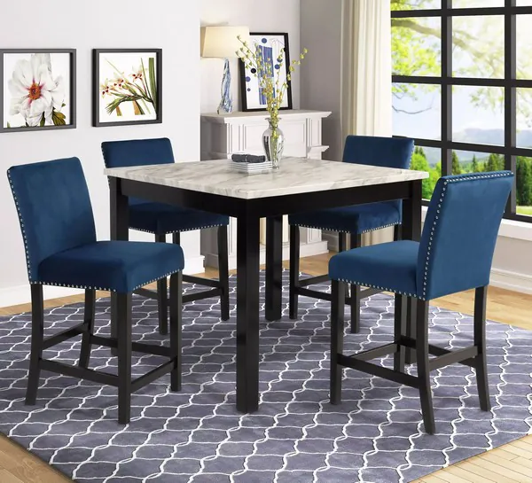 Celeste Espresso 5 Piece Marble 42" Counter Height Dining Set With Blue Chairs