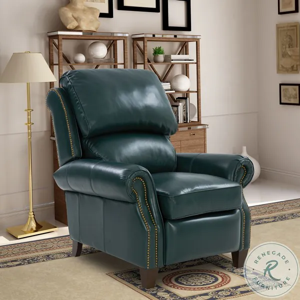 Churchill Collection from Barcalounger. Classic pub back 3 way low leg recliner with kneed back rolled arms accented with nail head trim. Luxurious comfort is enhanced with adjustable zippered upper and lower back pillows. Loose welted boxed seat cushion with pocketed coil springs encased in foam wrapped in Dacron with a down blend topper. Footrest extension for extra leg support. Hand carved wood legs finished in an Espresso color.