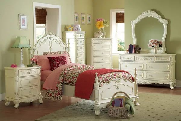 The Cinderella Collection is your little girl's dream. The Victorian styling incorporates floral motif hardware, antique ecru finish and traditional carving details that will create the feeling of a room worth of a fairy tale princess. A canopy bed completes the fantasy of this whimsical collection. Turned posts reach for the heights and are topped with carved finials. The additional trundle provides the extra sleeping space for princesses visiting from other kingdoms. Also available in dark cherry finish.