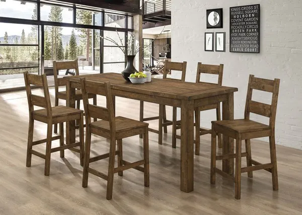 Share a homecooked meal together around this charmingly simple Coleman collection. A rustic golden brown finish brings out the rich grains of the solid hardwood construction. Farmhouse chic is a trending look right now, characteristically displayed with timeless craftsmanship and bold clean lines. The construction of the plank style tabletop and ladderback chairs makes this dining group feel handcrafted. The counter height design of this collection brings its primitive looks into the twenty first century.