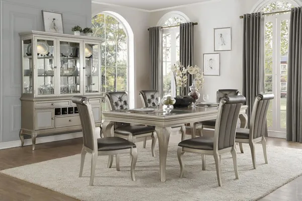 Blending traditional lines with modern glamour is the Crawford Collection. Finished in an eye-catching silver, the collection will be a dramatic addition to your home’s dining room. Cabriole legs lend traditional accent to all pieces in the collection. Unique accenting abounds in this collection, the tabletop features inset opaque glass panels and the chairs are enhanced with crystal button tufting. The china lends visual impact as well as functional display and behind drawer and door storage areperfect for your prized table top accessories.