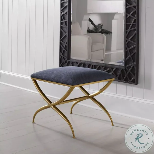 Crossing Collection from Uttermost. Classic yet stylish, these small benches features a curved iron frame finished in an elegant gold leaf. The cushioned top is upholstered in fabric, doubling as a comfortable seat or footrest.