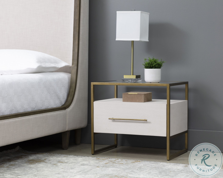 This nightstand, with its timeless design and refined details, introduces a touch of understated glamour to any bedroom. A single drawer, showcasing the natural beauty of acacia wood veneer, is exquisitely wrapped in bonded oyster shagreen leather, creating a captivating textural contrast. The clear tempered glass top adds a modern, sleek surface, while the antique brass iron hardware provides a subtle yet sophisticated accent. A coordinating dresser is also available, allowing for a cohesive and elegant bedroom ensemble.Features