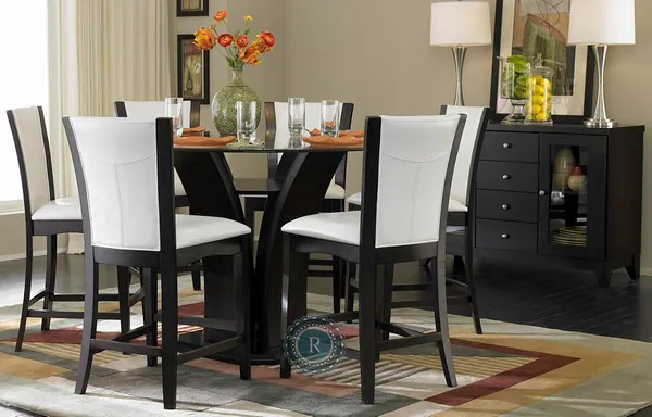Daisy Collection combines superb visual appearance and fine quality that you need in your dining area. Three distinct elegant flared tulip bases support beveled glass tabletops on the rectangular and round traditional dining height tables and a round gathering height table. Additional offerings in the collection are rectangular counter and traditional height wood tables featuring trestle bases with extension leaves, convenient for small or large crowds or the newly introduced rectangular table with inset black tempered glass. Counter and dining height chairs feature clean lines and sleek curves; available in both white and bi-cast vinyl and dark brown bi-cast vinyl. The set is constructed of hardwood solids and veneers in a refreshing espresso finish.