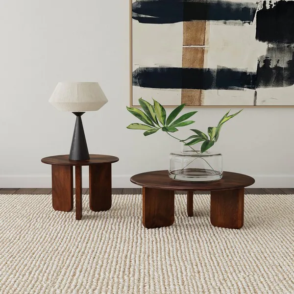 Embrace artistry with the interesting silhouette of a modern Dale Collection. Its designed to create an inviting presence at the center of your living room seating ensemble. The table features solid mango wood construction in a rich brown finish that allows wood grain details to show through. A round table top with a rounded edge creates an inviting centerpiece, while an interesting base adds visual dimensionality. Three slab legs are angled inward, creating depth and character that's sure to stand out.