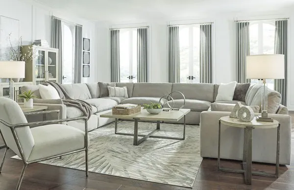 Dalenville Collection from Signature Design by Ashley. Contemporary modern design. Made with oak veneers and engineered wood in a warm gray finish. Accented with a distressed sand casted aluminum base in antique pewter finish.