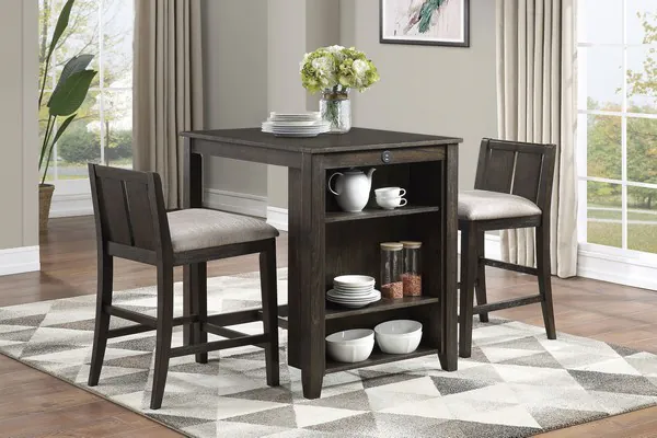 Modern convenience is paired with transitional design to create the multi functional Daye Collection. This unique casual dining set features built in display shelf, two USB ports and seating for two. Mindy veneer is finished in burnished brown cherry. The wood framed low back chairs feature gray fabric seat covers for neutral accent to the collection’s finish.