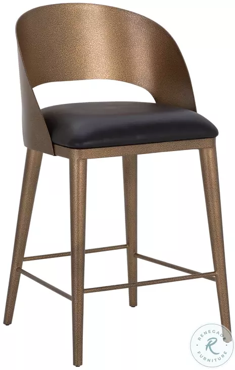 The Dezirae Counter Stool features a sleek profile with a strong curved back for a stylish design that will fit into any dining space. The legs and headrest are beautifully crafted from antique brass textured powder-coated iron. A charcoal leather seat adds an alluring contrast to round out the look. Handle with Care: This design has been crafted with 100% genuine leather. Leather is a natural material; as such, colour variations, markings, wrinkles, grooves and light scratches are acceptable and appreciated characteristics. No two pieces are alike. Visit our Product Care page for more information on how to ensure the lasting beauty of this piece.Features