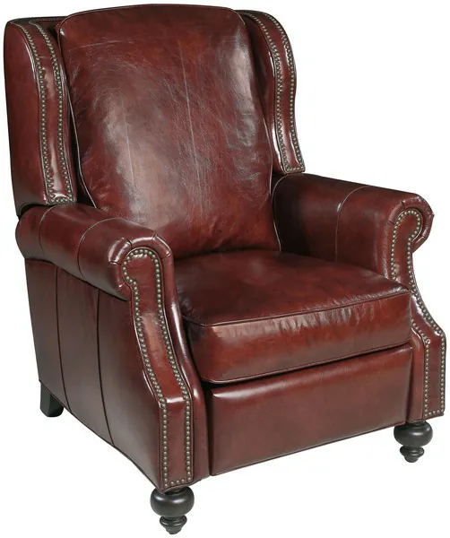 Relax in regal style in the designer friendly Drake Collection Recliners, a classic wing back silhouette covered in plush Aniline Top Grain Leather and wood trimmed. Nailhead trim and bun feet add a decorator touch. Simply push on the arms to recline in effortless relaxation.