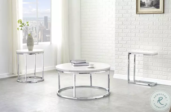 Your sense of style will reverberate with your guests when you add Echo tables to your living room ensemble. White marble tops and chrome finished metal bases will add sparkle and shape to any room and this collection features a Cocktail Table, End Table and Chairside End Table that can be added in any combination to fit your needs perfectly.