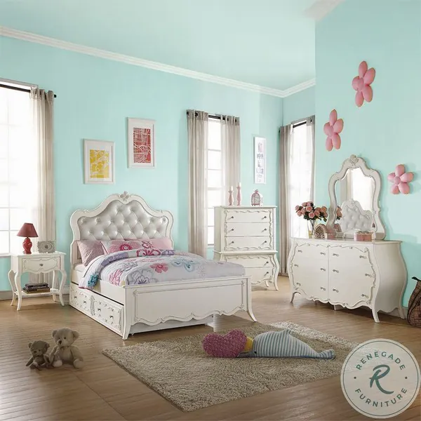 Create the dream bedroom for your little girl with Edalene collection. Beautiful accents are seen throughout the case goods, including clear rosette knobs and tapered legs. The bed features a pearl white tufted headboard. With many storage options and details like floral felt lined drawers, the collection is ideal for a child’s room. The gorgeous details in each piece make the Edalene collection perfect for your little princess.