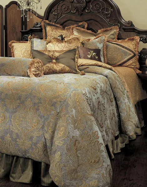 Find your timeless, grandiose style with Elizabeth bedding by Michael Amini. Made with beautiful spa blue chenille and golden tones with brown accents, this set features embroidered gold silk, a coordinating multi stripe and paisley accent patterns, and reversible pieces. The comforter reverses to a gold jacquard frame.