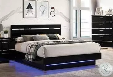 Be ready to set the right mood anytime with this tantalizing bedroom set. The main draw here is of course the ambient LED lighting lining the bottom edges of the platform bed reminiscent of neon lights of the olden days. Reflecting light beautifully to add to the daring environment the chrome accents on the headboard match those of the casegoods. Finished in sleek glossy black this ensemble is a testament to the enduring allure of futuristic settings amped with nostalgic flair.Features