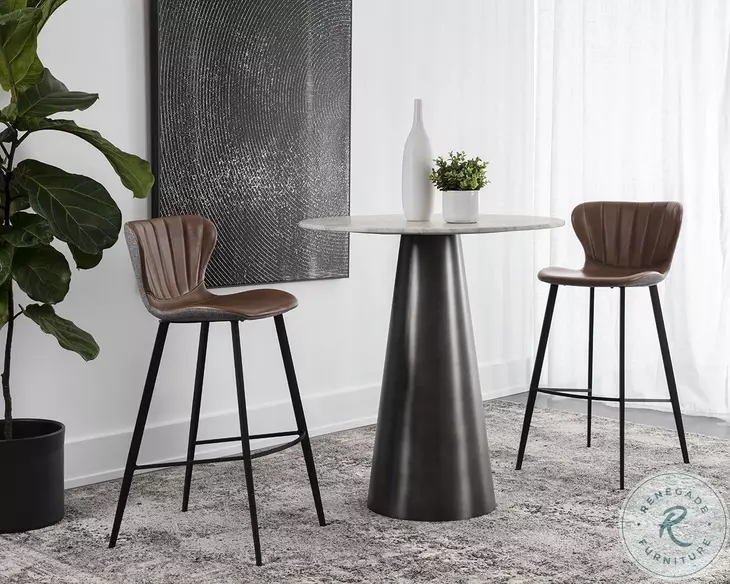 A compact barstool designed with a modern feminine style. Features clamshell style tufting on the seat back. Stocked in bravo cognac faux leather with a november grey fabric exterior. Finished with black steel legs. A stylish seating option for dining spaces of all sizes. Handle With Care: This design has been crafted with faux leather. Faux leather is manufactured to reflect the natural characteristics of leather; as such colour variations markings wrinkles grooves and light scratches are appreciated characteristics. No two pieces will be alike. Visit our Product Care page for more information on how to ensure the lasting beauty of this piece.Features