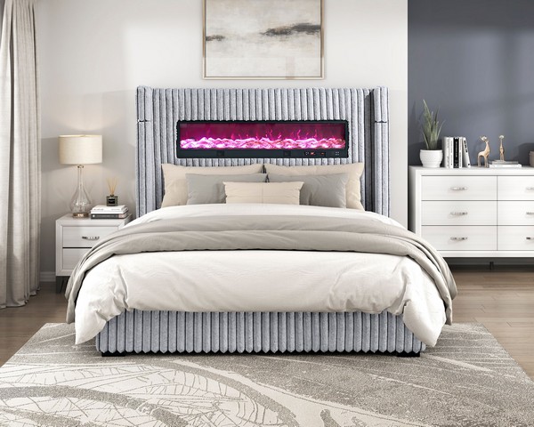 Fitzroy Gray California King Upholstered Low Profile Bed with Electric Fireplace