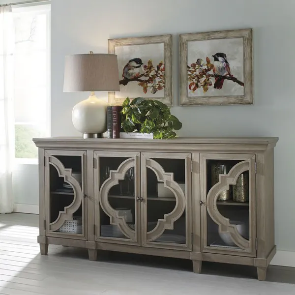 Wowing with exquisite quatrefoil framing, made all the more dramatic with the contrast of clear glass, the Fossil Ridge Collection cabinets serves up an easy elegant aesthetic sure to satisfy. The light and lovely finish brings a relaxed sensibility to the scene.