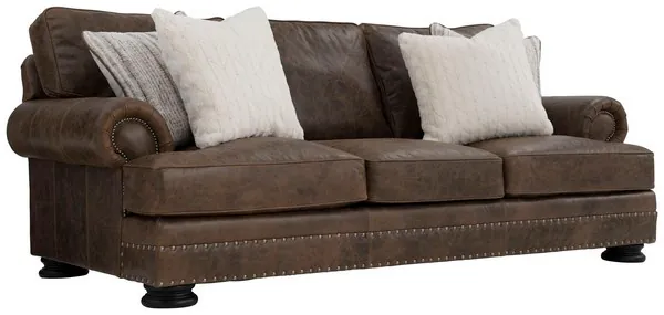 Foster by Bernhardt Furniture. Sinuous Spring Construction, Spring Down Cushion and Antique Brass Nail head Trim. Round Arms.