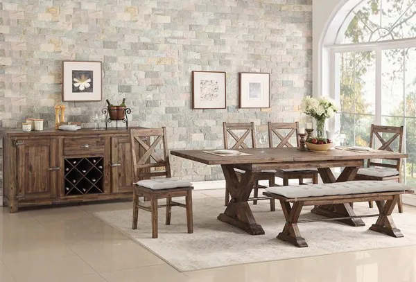 Enjoy the beauty for the Fresno Dining collection. The design, style and function of this collection can meet any of your dining needs. The table has a leaf if you have extra guests. The dining chairs and bench have tie on cushions that you can relax in during any meal. Need storage The server can meet your needs with ample bottle storage, a drawer and two cabinets with shelving. The rustic design can fit in almost any dining room.