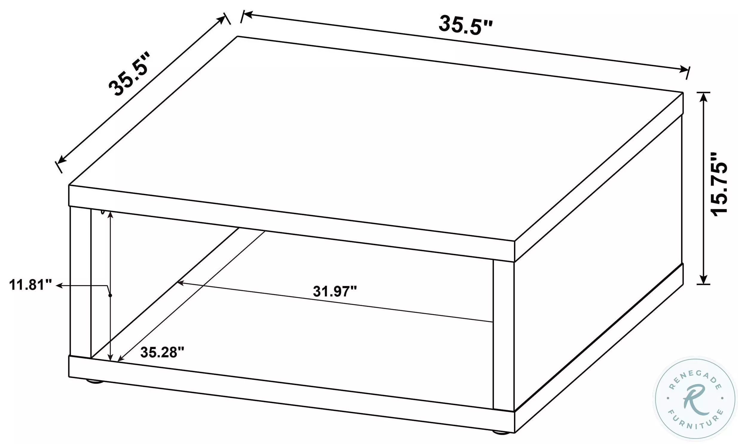 Infuse organic character in a modern living space with this charming coffee table, constructed from top-selling, engineered wood that mimics a light and airy, distressed pine finish. Its versatile, simplistic design offers plenty of color variation to create impeccable dimensionality. The table showcases a structured, cubic design with geometric, square cubby-like features, complete with two open and two solid sides for easy access storage or display. Sitting low to the floor, it creates a casual ambiance, perfect for gathering with friends and family. The lower shelf is a convenient space for books and decor that add personality.Features