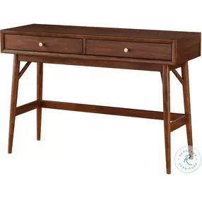Providing functional use and retro-modern styling for your home is the Frolic Collection. The counter height desk, writing desk and 64-inch wide TV stand allow for perfect placement within your home to fit your individual needs. The brown finish combined with polished nickel knob hardware and a mid-century inspired profile, all blend effortlessly to create this stylish home collection. The design of the occasional tables allows for perfect placement within your home to accent your busy lifestyle.