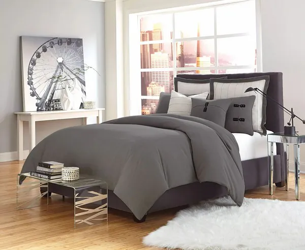 The Fusion duvet set features cool, contemporary grays and light linen blend fabrics for a crisp and fresh finish. With black belt accents and cleanly channeled contrast shams, this contemporary piece is the perfect modern set for every home.